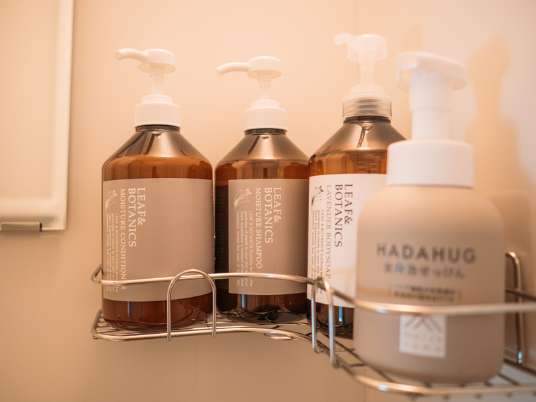 シャワールームは男女共用と女性専用の2つ。センター長が数年かけてあれこれ選び抜いたLEAF&BOTANICSのシャンプー・コンディショナー・ボディソープと、お子様用の泡ソープも設置。ドライヤーは勿論、クレンジングオイルも用意しています。すべてのお部屋にバスタオル付。
