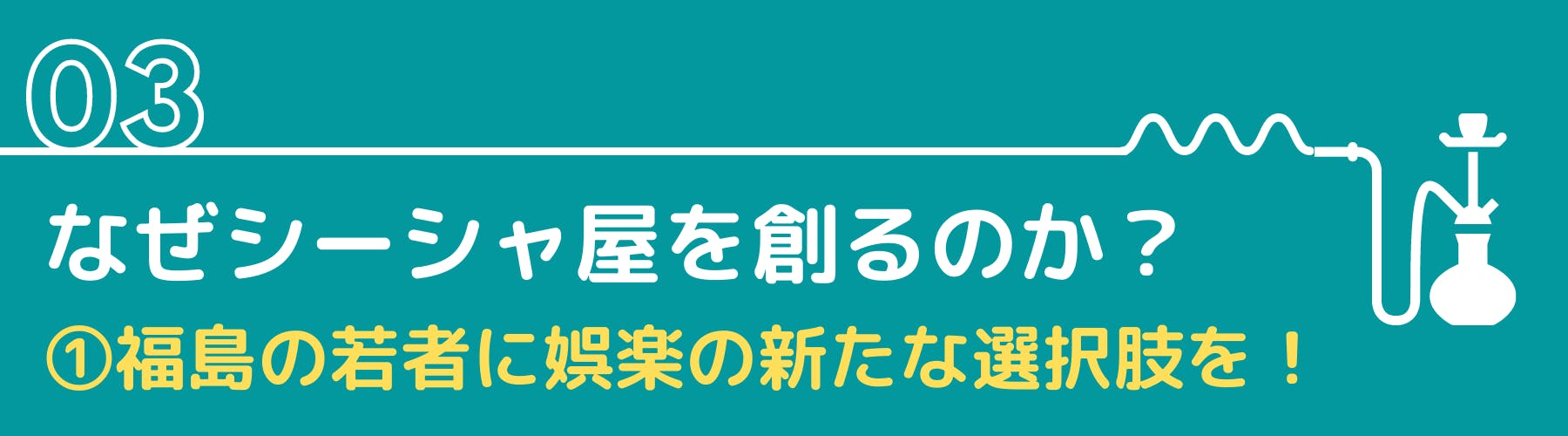 僕たちはこうした現状に課題を感じています。このままでは【若者が都会に出てしまう】【築かれた伝統が守られない】【地域が廃れていく】そうなりかねないと思います。そこで僕たちは、『福島にも若者が楽しいと思える場所を創る』そして、『若者が集まる場所を創ることで福島の良さを伝えていく』ことがこの課題解決の糸口になるのではないかと考えました。その若者が集まる場所を創る一つの手段をして、今回シーシャ屋さんを開くことを決めました。