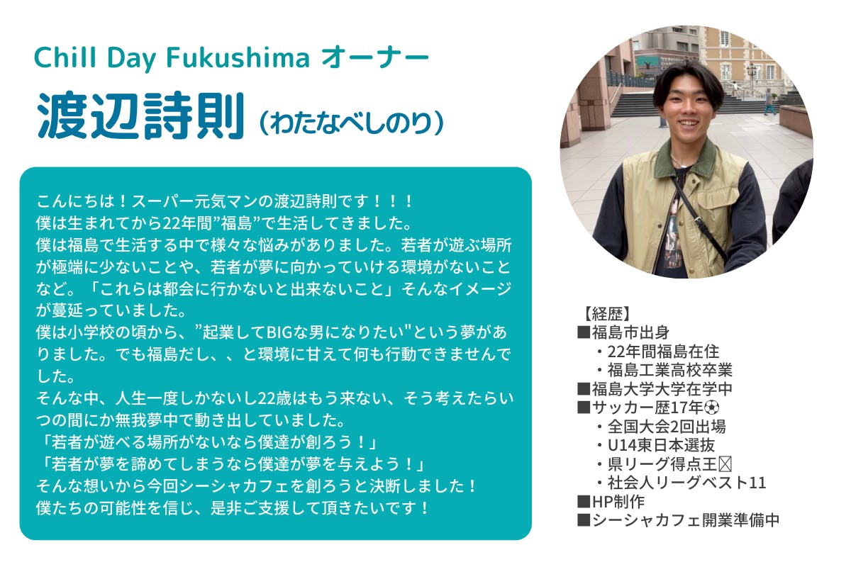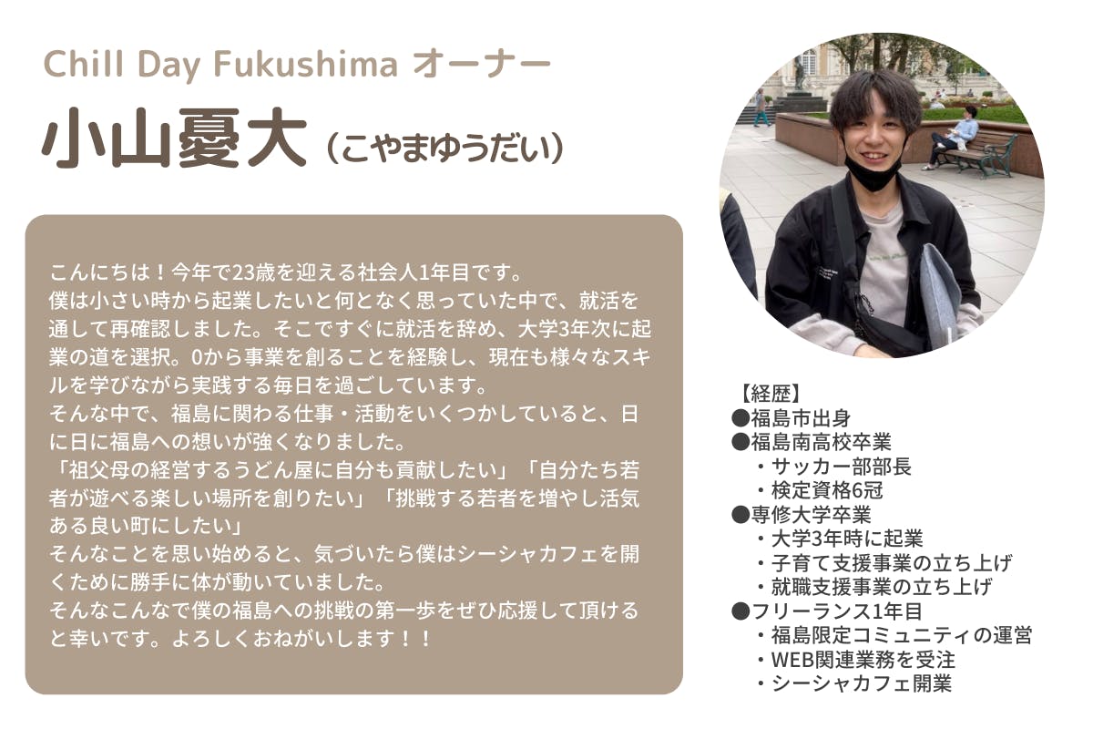 はじめまして! Chill Day Fukushimaの共同オーナーの小山憂大です。 今回、僕たちは【福島市】に、①若者が集まり繋がる場所②若者が前向きになれる場所を創るために本プロジェクトを立ち上げました。 「夢はあるけどどうせ無理」そう思っている若者に、挑戦している僕たちの姿を見て、”夢に向かって挑戦する”勇気を持ってほしい! そして、福島を夢で溢れている町にしたい! そんな想いで、現在シーシャカフェをオープンするために頑張っています!! ぜひみなさんと一緒にシーシャカフェを創り上げていきたいです!! 応援よろしくお願い致します。
