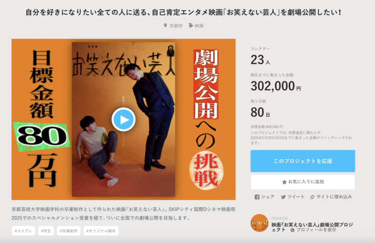 京都芸術大学映画学科2024年度卒業制作である、映画「お笑えない芸人」の劇場公開を目指すプロジェクトです。