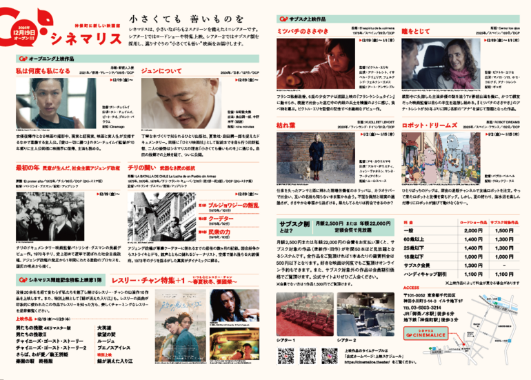 小さくても良いものが集まっている町、神保町・お茶の水エリアに2025年開業予定。2スクリーンを備え(合計座席数約130席)、シアター1ではロードショー及び特集上映を、シアター2では準新作に旧作・名作も交えて「サブスク」上映を行うハイブリッド型ミニシアター。誰でも気軽に立ち寄れる「居場所」「逃げ場所」の提供を目指します。