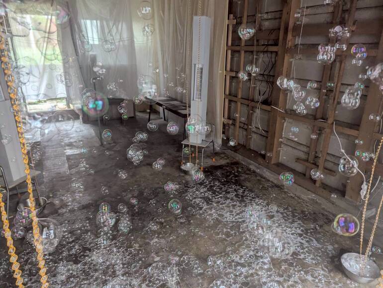 展示空間内を、ゆらゆら無数のシャボン玉が舞っている光景は、宛ら夢を見ているかのよう。