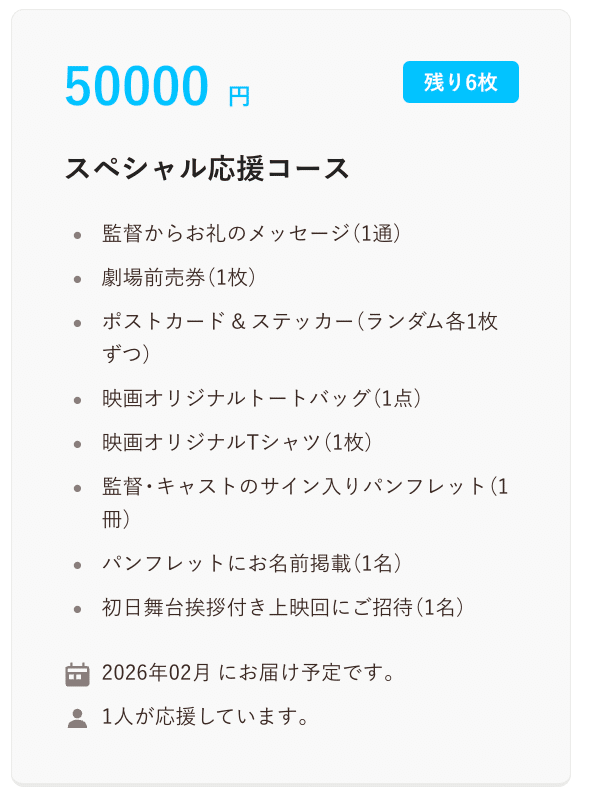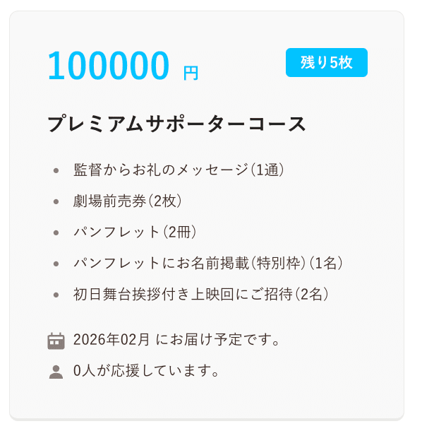 なお、クラウドファンディングの下記リターンには初日舞台挨拶へのご招待チケットも含まれています。