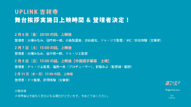 アップリンク吉祥寺公式サイトにて、本日1月27日(火)22:00より、舞台挨拶実施回のチケットが先行販売となります。