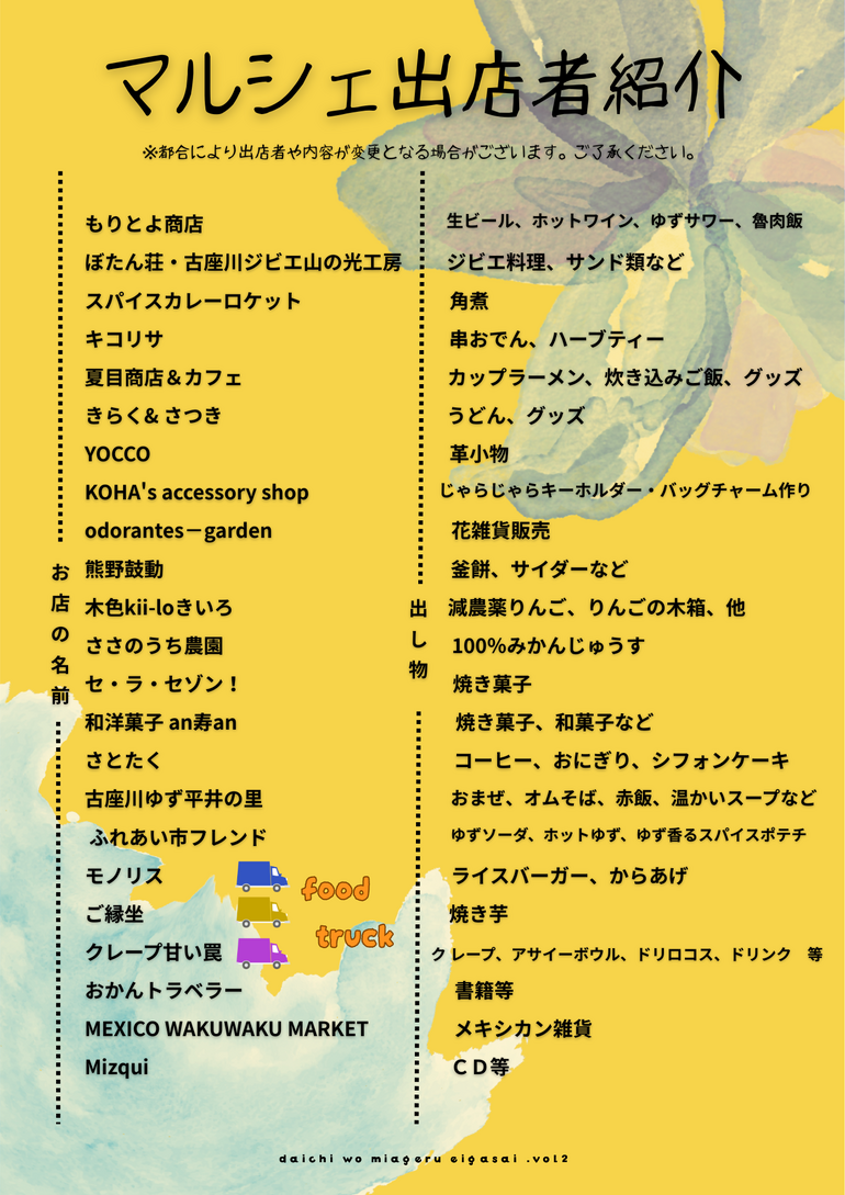 マルシェ : なかなか一堂に会することのない、紀南地域や古座川を代表するお店屋さんが一枚岩に集結!!地元の素敵なお店や商品を出している方々が夢のコラボをして出店していただきます! 美味しい食べ物屋さん、おしゃれな小物屋さん、いろんな方が集まって作り上げるマルシェを楽しめます。