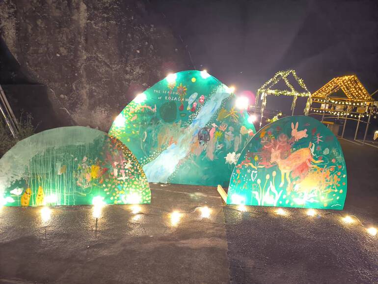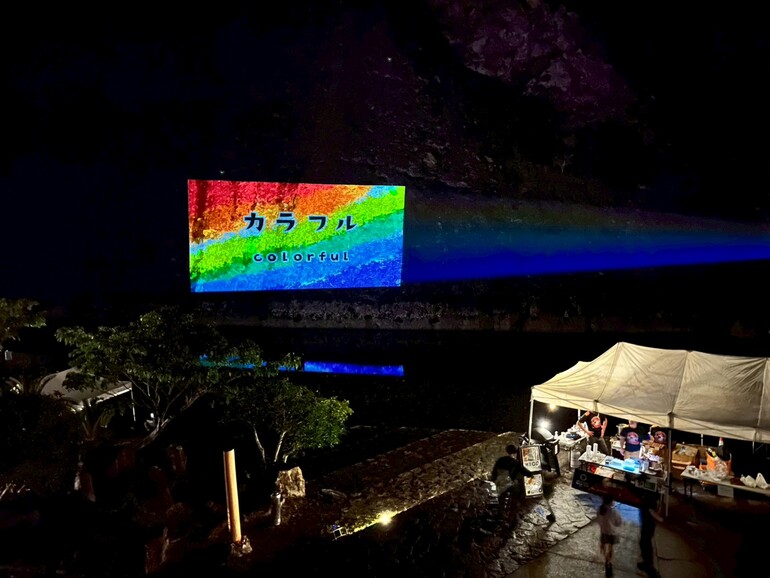 大音量で聴く素敵な音楽と一枚岩に映る鮮やかな映像美が会場を彩りました!あいにくの雨でしたので岩が濡れたせいで少し暗く映ってしまったかなぁというところはありましたが、それでも十分楽しめたかなと思います!