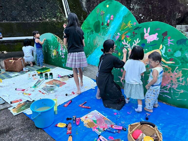 ライブペイントでは、三つの山にペイントをするイラストレーターのさつきちゃん と、群がるキッズ達(笑)。壁に絵を描く機会なんて、なかなかないですよね〜、目を輝かせた子供達が入れ替わり立ち替わり、お絵描きに参加してくれました。さつきちゃん曰く、一緒に絵を描くのは楽しいんだけど、気づいたら描いた絵が塗りつぶされてるから、戦いでもあったそうです(笑) 終わってみたら、めちゃ可愛い三つの山の四季が生まれていました。