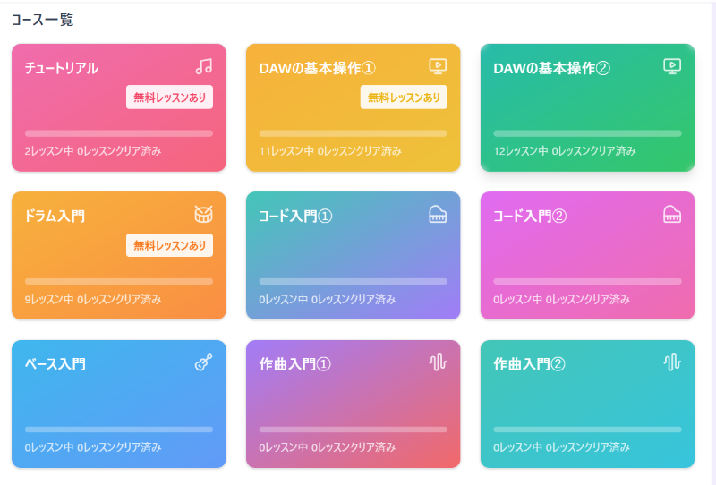 ↓コース一覧:現在9コースを予定しています。「音を出す」から「楽曲制作」まで、段階的に学べるカリキュラム設計
