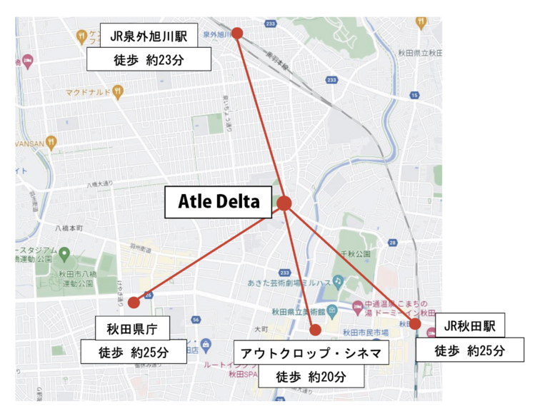 秋田新幹線が発着する秋田駅からDELTAまでは、徒歩20分ほど。バスや車を使えば7分の場所です。