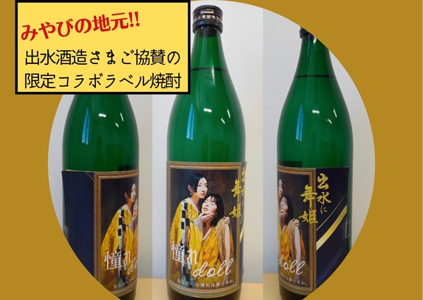 →みやびの地元でもある鹿児島の出水酒造株式会社さまの芋焼酎「出水に舞姫」の”憧れdoll”コラボラベルバージョン。「出水に舞姫」は黄金千貫芋を原料に白麹で仕込んだ原酒と黒麹で仕込んだ原酒をブレンド、それに和甕仕込の 古酒を加えて味を整えた芋焼酎です。