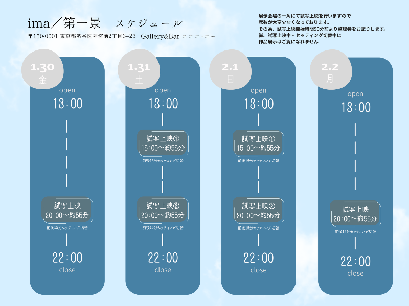 『ima/第一景』の展示スケジュールをお知らせいたします。