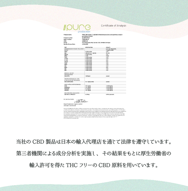 【CBD】とは、麻から抽出される成分です。最近では、シーシャ等の製品にも使われている成分になります。日本では、麻植物由来というとマリファナのイメージが強いですが、THCという精神作用のある成分とは異なります。大麻取締法では成熟した茎から取れたCBDは合法で、我々は日本で合法なCBDを使用しています。