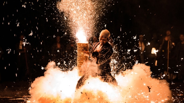 豊橋が発祥の地と言われる手筒花火は、直径10cm、長さ約80cmの節を抜いた孟宗竹に縄を巻き締め、硝石や硫黄に木炭を混ぜた黒色火薬に鉄粉を加え、1.8kg~3kg位詰めて噴出する東三河地域独自の花火で、揚げ手が筒を脇の横に両手でしっかりと抱えるように持ち、巨大な火柱を噴出させ、最後に「ハネ」と呼ばれる炎が大音響とともに足元に吹き出す勇壮な花火です。
