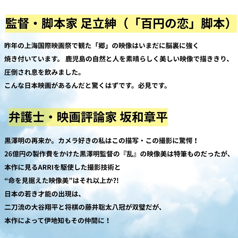 そこで私たちは、『郷』の全国劇場公開への実現に乗り出しました。このチャレンジは、リスクを冒して、これから出会えるであろう、まだ見ぬ『郷』の可能性を追求する壮大な試みです。