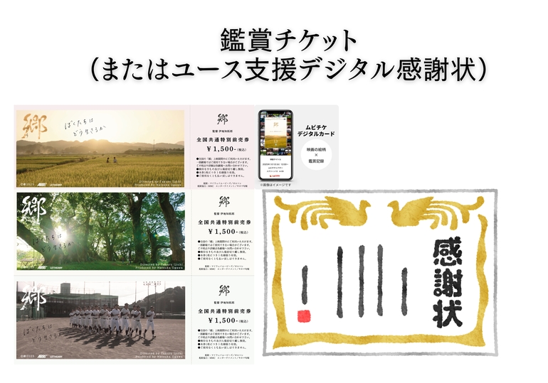 今回ご支援いただくと、「鑑賞チケット」は、1月9日からスタートする上映館に加え、今後新たに決まった映画館でもご利用いただけます。1月8日までに支援いただいた方にはムビチケオンラインをお送りし、1月9日以降は紙の鑑賞券をお送りする予定です。またチケットを学生(小中高生)に贈る=<ユース支援>という取り組みを実施しております。それは『子どもたちに“映画館という居場所”を作る』という本クラウドファンディングの趣旨を実現するためです。映画館で映画を鑑賞する習慣の少ないユース世代にこそ、『郷』を映画館で体感してもらいたいと、切実に思っております。