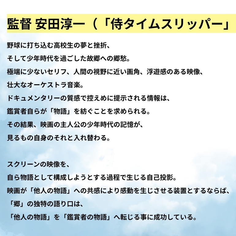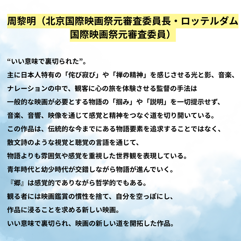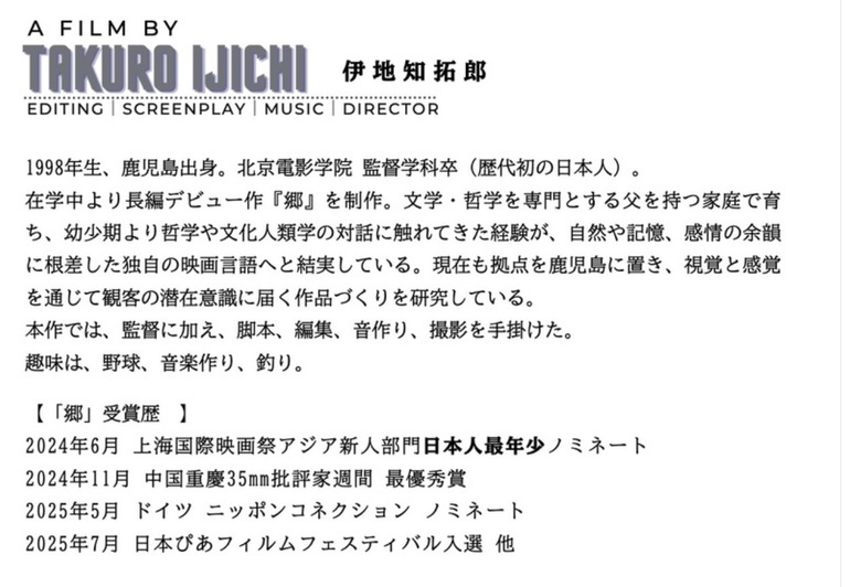 北京電影学院監督学科卒の伊地知拓郎監督は、視聴覚言語を徹底的に研究し、台詞を極力そぎ落とすことで、「心で見て、感じる」映画に挑んだ。その結晶たる93分の映像の塊は、まさに“映像美のエスプレッソ”と呼ぶにふさわしく、観る者に「今をどう生きるか」を問いかけ、魂を揺さぶる。言葉を超えたその体感が、観客一人ひとりの疲れた心を、そっとほどいてゆく。