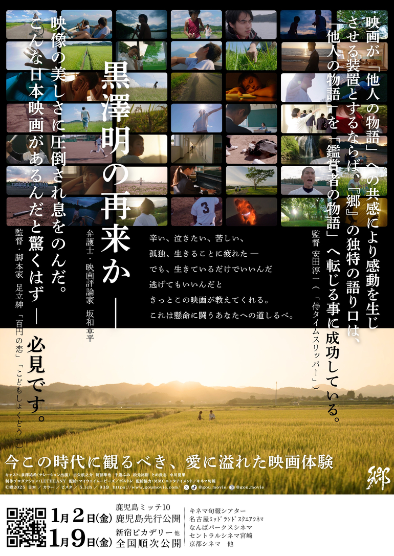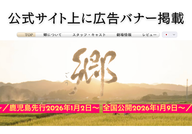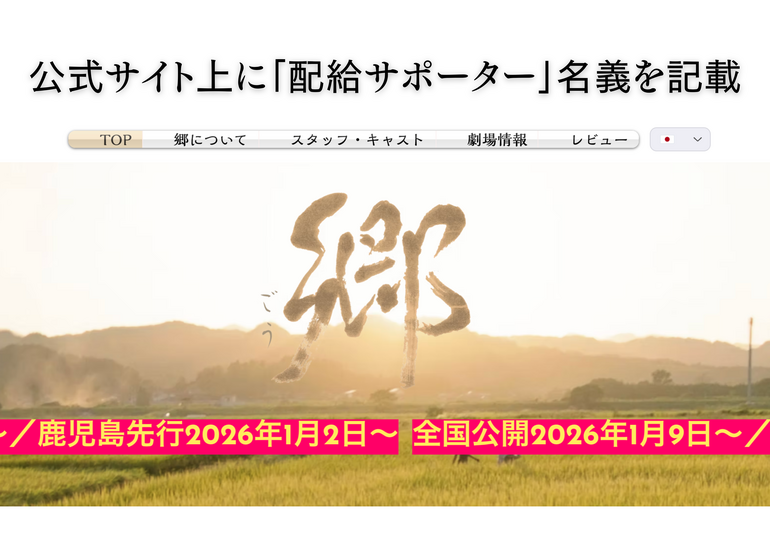 初めまして。ページをご覧頂き、ありがとうございます。映画『郷』上映実効チームです。映画『郷』は2026年1月2日より鹿児島ミッテ10での先行上映を皮切りに、1月9日より新宿ピカデリー、大阪なんばパークス、名古屋ミッドランドスクエアシネマ、宮崎セントラルシネマなど全国順次公開となります。今回の取り組みでは、映画を社会に広めていくために必要な映画配給制度の中で新しい取り組みとして、“観客配給”を実施します。“観客配給”とは、支援1口がそのまま上映劇場や上映週の確保に変わる新しいチャレンジです。皆様がご支援いただくことで、映画『郷』の上映館の拡大・上映の継続を促進していきます!!!