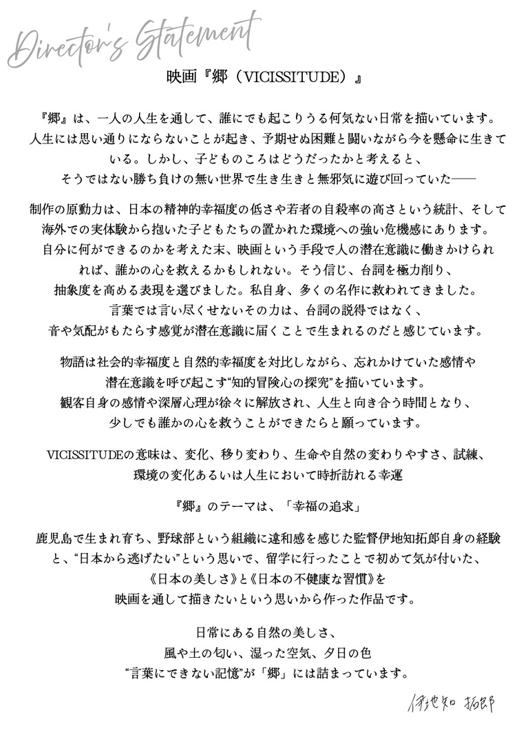 元々、製作初期には「流転」と呼び、生き物や命の移り変わりを示すタイトルを掲げていました。脚本段階では「その一瞬を噛み締めて」という仮題も経て、最終的に選んだのが『郷』です。この一文字に、故郷や土、無常、そして郷愁への思いを重ねていった。私たちは土から生まれ、いつか土に還っていく──その自然の循環とふるさとへの感情を、この題名に託しています。