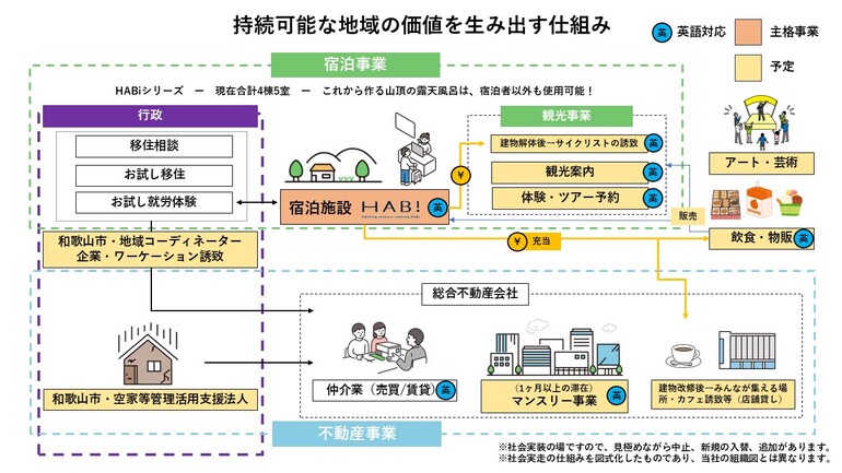 下記のサービス連携から始め、多様な人が訪れたくなる持続可能なしかけ作りをいたします。社会実装の場ですので、当面はトライアンドエラーがあると思っています。また、中長期目線では、時代の流れと共に求められるものが変わることでの調整も出てくると思っています。本業の不動産業以外は、宿泊業同様に利用者の流れをみて各事業毎に現実的な着地点を模索し持続可能な地域の価値を生み出していける施設集合体を目指します。