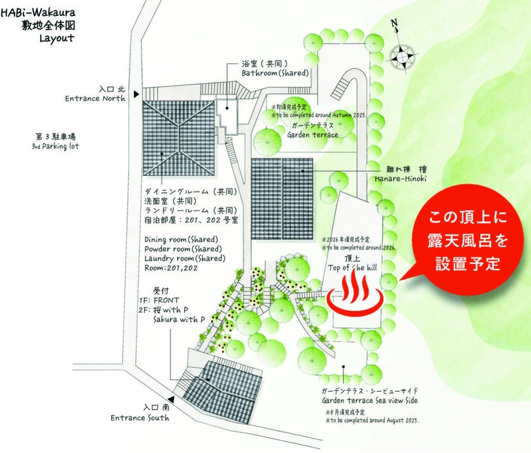 朝ジョギング終わりに山頂でシャワーを浴び、見晴らしがよいテラスや山頂で一息ついて、仕事に行く朝の時間を大切にするビジネスマン、ワーケーションしながらHABiに滞在する人、ちょっと気分転換したい人、お風呂好きの方、夏は海水浴の後に使って頂いたりと、明日を元気に迎えたい人達にリフレッシュ目的で国内外宿泊ゲスト以外にも年中ご利用頂く。そんな空間を作り、訪れる人が増えてくれればと願っています。