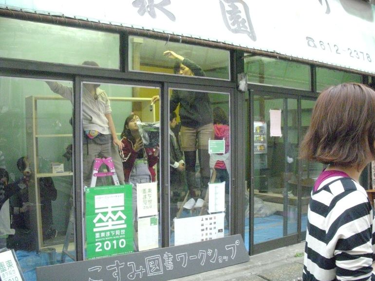 元お茶屋さんのこの空き店舗は、長い間だれも住んでいない状態で中には荷物がぎっしり詰まり、建物は傾き始め、雨漏りもありました。そんな状態だったところ、2010年にこの地域で行われた地域アートプロジェクトをきっかけとして、若者たちが大がかりな掃除と内装リノベーションをほどこし、「こすみ図書」としてオープンしました。