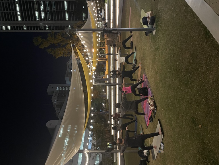 そんな講演会が行われている建物の向かい、小さな芝生広場ガーデンステージでは、公募プログラムという、市民のボランタリーな企画で花金YOGAが。