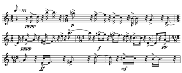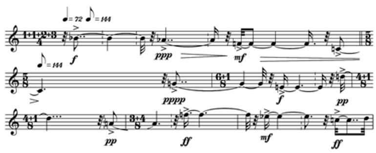 上にリストされた音価とそれに対応する集合の要素数は、次の譜例にみるようにアルトフルートのパートで具現化されますが、その際、音価を構成する最後の1/32は休符か、その後に続く音に置き換えられます。なお、小節内の副小節は音楽的な内容の区切りを表しています。