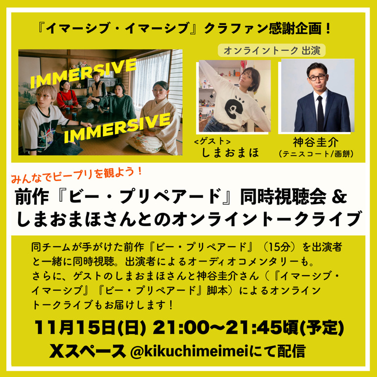 前半は、同チームが手がけた前作『ビー・プリペアード』(15分)を出演者たちと共に視聴できる同時視聴会 。出演者たちと、前作を同時再生しながら、撮影時の裏話やエピソードをお楽しみいただけます。(再生タイミングはスペース内でアナウンスいたします)