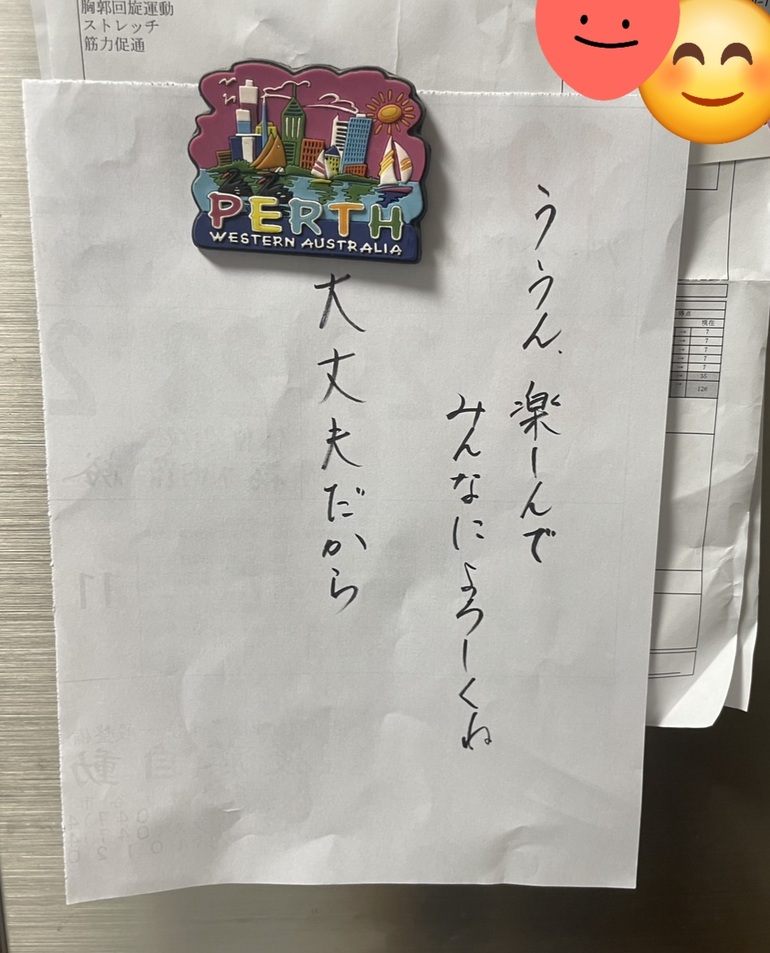 家族LINEに、この写真が送られてきました。母の台詞です。冷蔵庫にはって練習している..!一応監督の動画オーディションもあって、見事突破したお母さんです。
