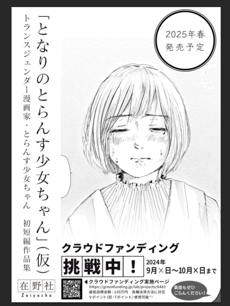『となりのとらんす少女ちゃん』(とら少/ISBN978-4-9913920-0-9)はトランスジェンダー当事者が作者であり、これまでにない当事者のリアルに触れる描写が好評を得ていますが、本書の発行に先立って行われたクラウドファンディングの際には、SNSを中心にトランスフォビック(トランスジェンダーに対する嫌悪的)なことばをかけられることもすくなくありませんでした。