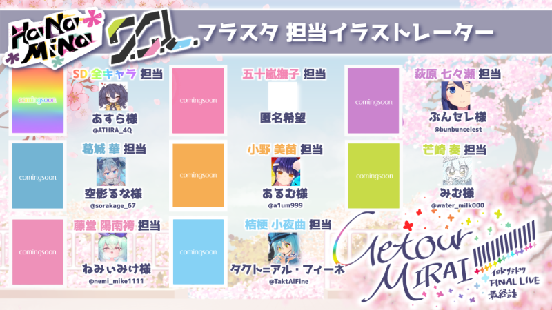 メンバー14人それぞれをモチーフとしたフラワースタンドを制作し、会場内へ展示することを目的としています。スタンドには描き下ろしイラストを使用した装飾パネルを設置し、キャラクターごとに個別テーマを持たせた構成で制作を進行いたします。