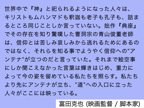 福岡県北九州市にあるこの教会は、監督自身も、困っていた時に辿り着き「ここに引っ越そう」と決意した場所でもあります。様々な境遇を経験した人たちの言葉と、演劇素人が聖書に書かれていることを演じるその光景から、コロナ禍で苦しんでいる人、いやコロナじゃなくても生きるのが辛い人、いや全く生きることは辛くないけど映画が見たいという人に、どうか見て欲しい作品です。
