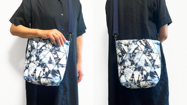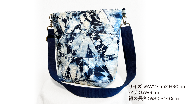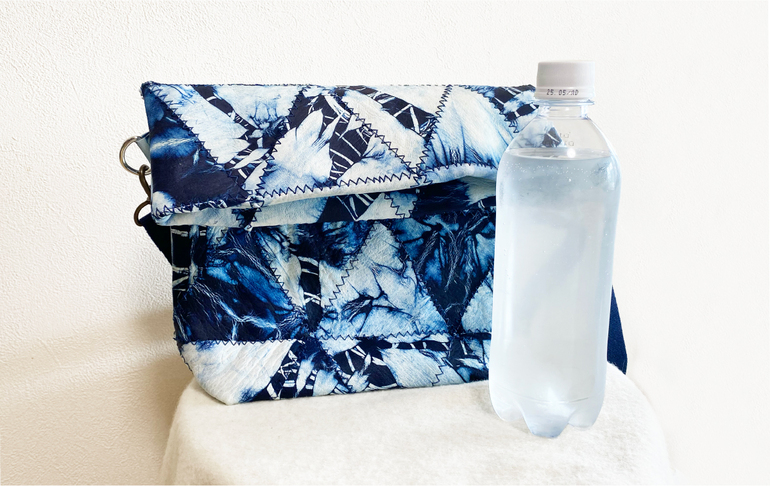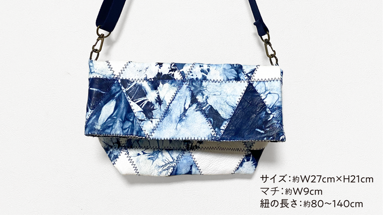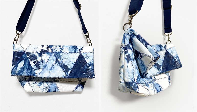 鹿革に藍染を施した生地を、三角形でデザインしたバッグです。