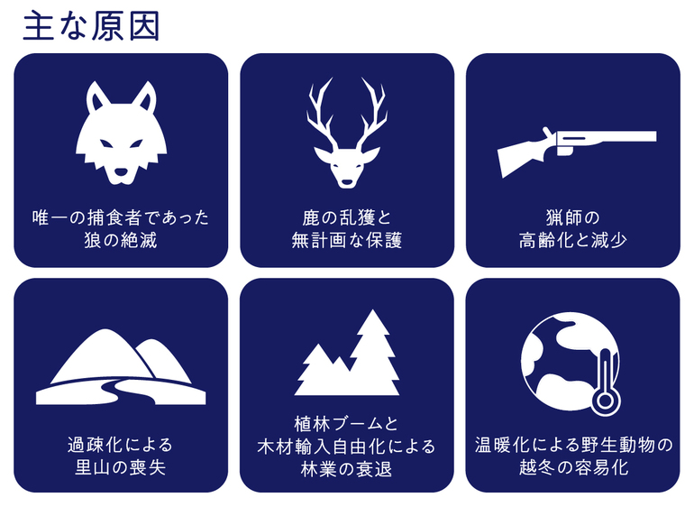 鹿が増えた原因は諸説ありまが、決定的な原因というものは無く様々な要因が複雑に絡み合う事で今日の増加を招いています。