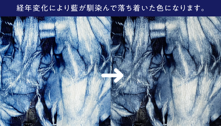 経年変化によって出てくる風合いには同じものは一つもなく、使えば使うほど味や深みが増し、自分だけの藍色を育てることができるという点が、古くから日本人に愛されて来た理由の一つとも言えます。