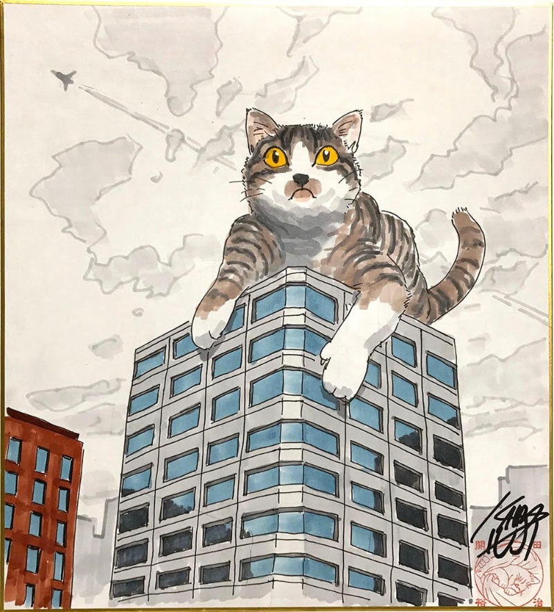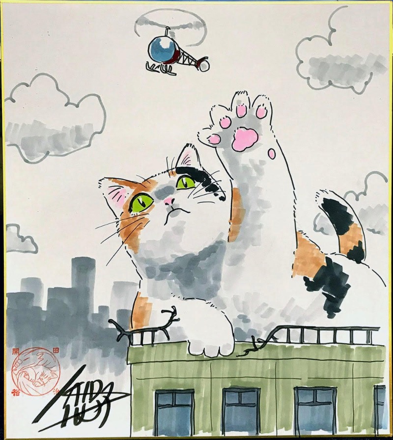 350万突破のストレッチゴールは、開田裕治描き下ろしネコ怪獣色紙(フルサイズ)です。以前のミニ色紙(13.6cm×12.1cm)より一回り大きいフルサイズ(27.3cm×24.2cm)です。図柄は以下の3つ。A、B、Cともに限定3枚で、各50000円になります。
