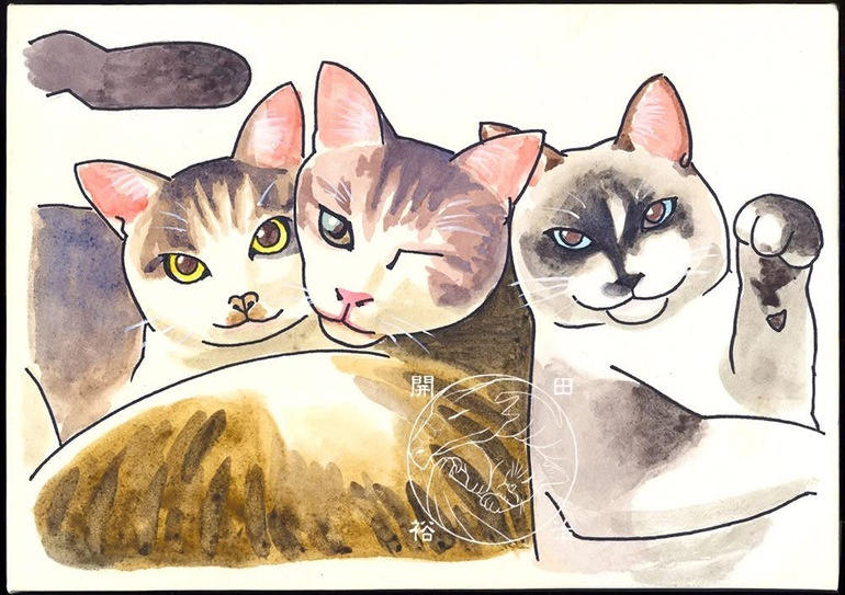 怪獣やメカのような重い絵ばかりでなく猫の絵も描くのです。今回の作品集にも収録します。この三匹は現在開田家にいる猫たち。もっと可愛く描けと睨んでいます。