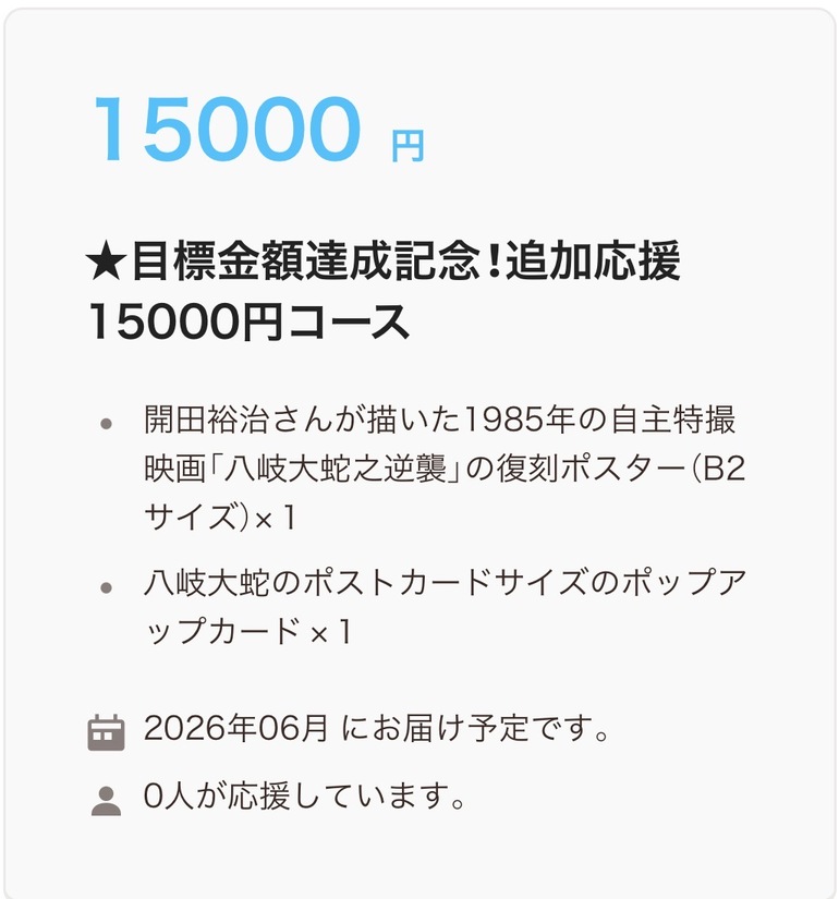 ただいまモーションギャラリーから「目標金額250万達成につき、15000円の新規リターン購入画面を更新した」との連絡がありました。開田裕治が描いた「八岐大蛇の逆襲」のB2判ポスターとポップアップポストカードのペアで発送されます!