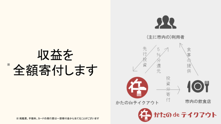 ※10,000円以上の寄付をしていただいた方には、かたのdeテイクアウトHP内でお礼として名前を掲載させていただきます(1ヶ月以上)