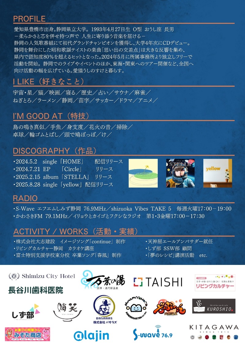 愛知県豊橋市出身。静岡県立大学。 1993年4月27日生 O型 おうし座 長男 −柔らかさと芯を併せ持つ声で 人生に寄り添う音楽を届ける− 静岡の人気歌番組にて初代グランドチャンピオンを獲得し、大学4年次にCDデビュー。 静岡を舞台にした昭和歌謡テイストの楽曲「思い出の交差点」は大きな反響を集め、 県内で認知度80%を超えるヒットとなった。2024年5月に所属事務所より独立しフリーで 活動を開始。 静岡でのライブやイベントのほか、東海・関東へのツアー開催など、全国へ向け活動の幅を広げている。 愛猫うしのすけと暮らす。