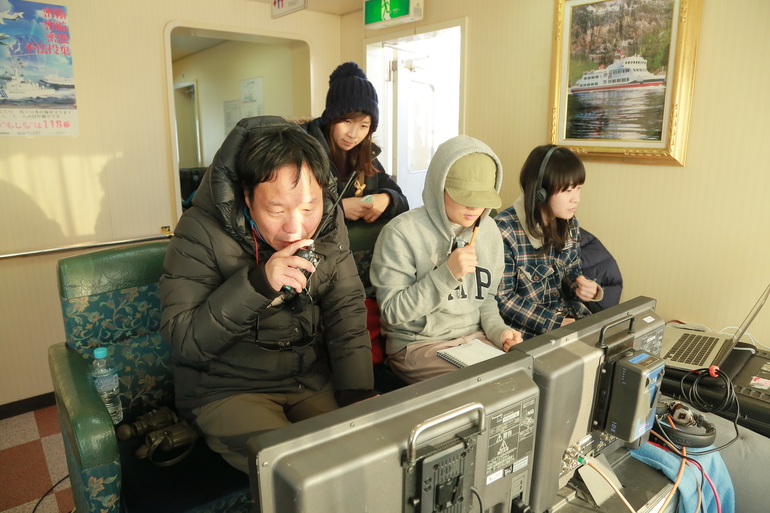 【ドローンのリアルタイム映像にて細かい撮影指示を出している】