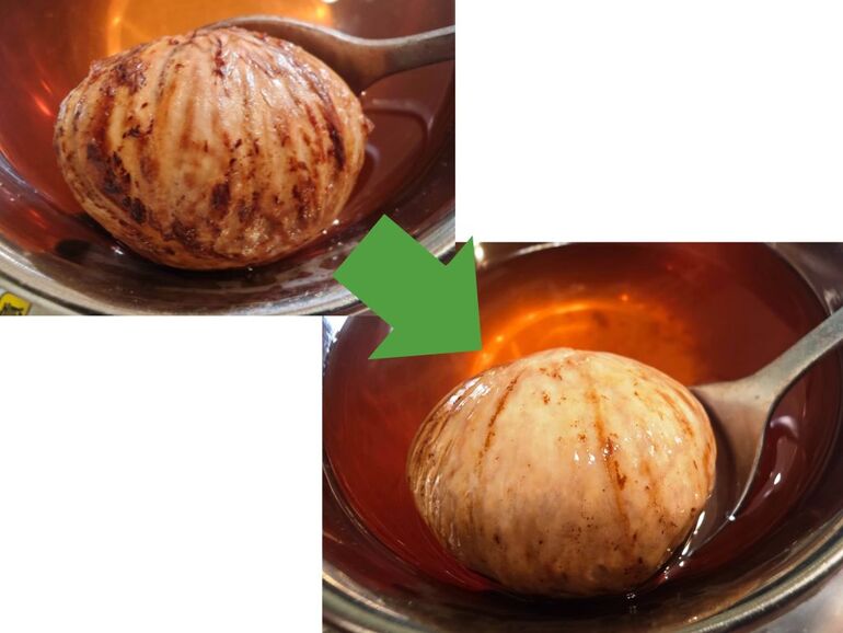 【お砂糖を入れる前に栗の表面の渋皮をきれいにお掃除します。この時も皮が破れやすい】