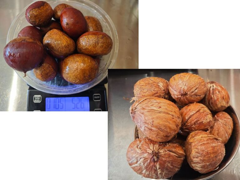 【15個の栗からスタート。渋皮を傷つけないように慎重に鬼皮を剥いたところ】
