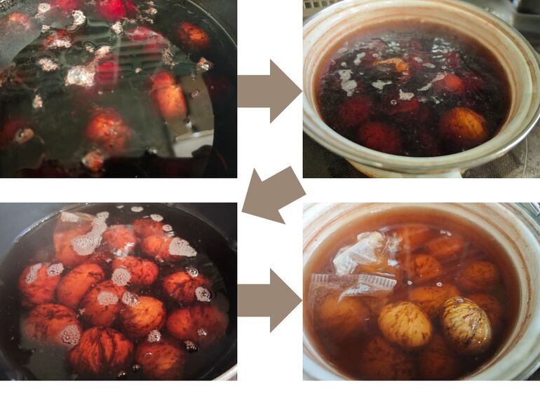 【重曹を入れて1回10分、お湯だけで10分ずつ3回、渋抜き】