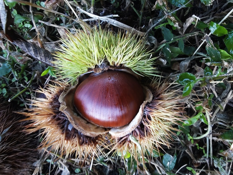 栗拾いができるのは毎年9月下旬から10月上旬の約2週間。この時期は朝と夕方の2回拾っています。イガの中にコロンと立派な栗が入っていて、イガから栗を取り出すのはとっても楽しい作業です。栗拾いの後は、カフェきたので煎りたてコーヒーをどうぞ!