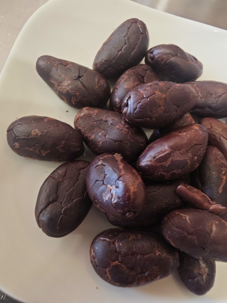 カカオ生豆を丁寧に焙煎し、香ばしい香りが立ったところで皮をむきます。