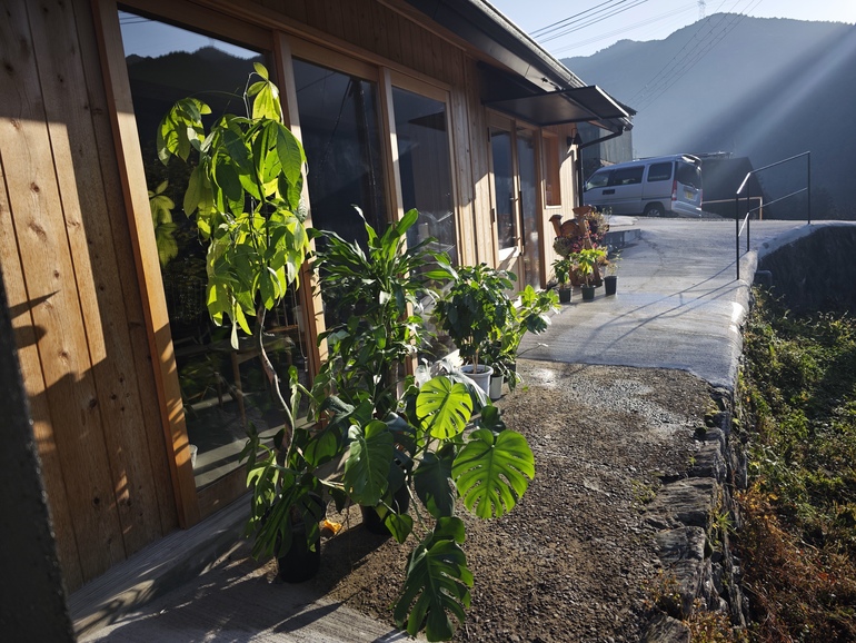 (今朝のカフェ前。植物たちも朝日を浴びて気持ちよさそうです。)