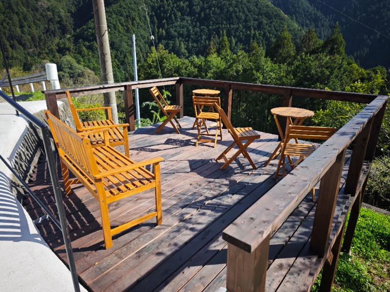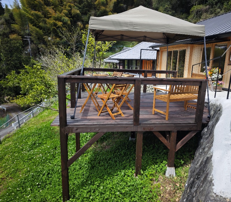 先週の土曜日、椅子を組み立てているところに、近所にタケノコ掘りに来ていた家族がカフェに立ち寄ってくれました。タケノコ掘りの後だったので、泥だらけの地下たびに作業服姿。まさに「土足OK」のテラスが活きる瞬間でした。まだ天幕はなかったのですが、早速テラス席でコーヒーや梅ジュース、軽食を楽しんでいただきました。