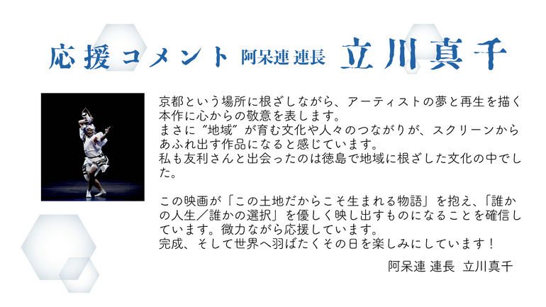 友利監督が過去作でお世話になった徳島県阿呆連の連長 立川 真千さんから、クラウドファンディングへのコメントをいただきました!立川さん、素敵なコメントをありがとうございます。