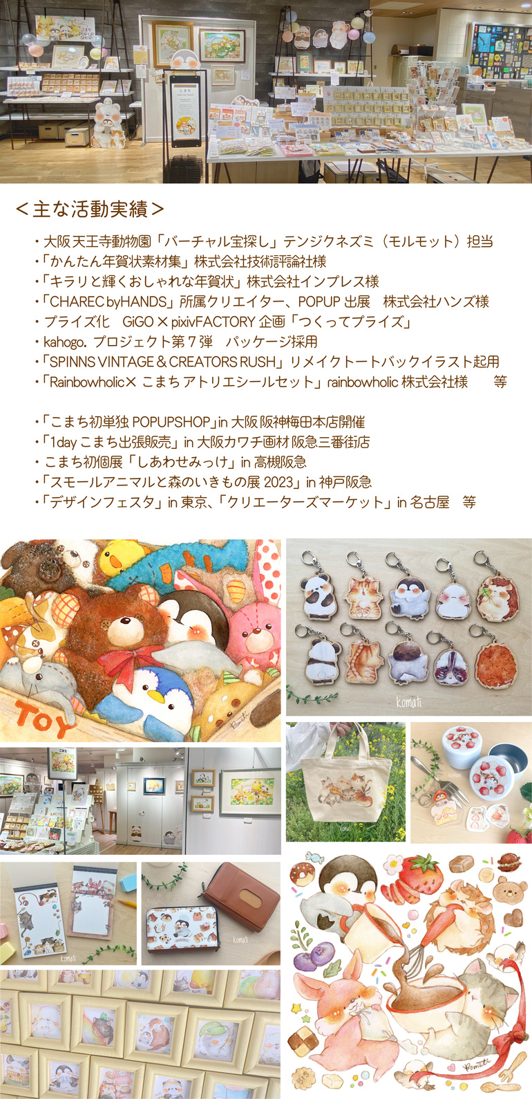 挿絵や商品イラスト等制作の他、百貨店や各地イベントで原画やオリジナルグッズの展示販売を行っています。